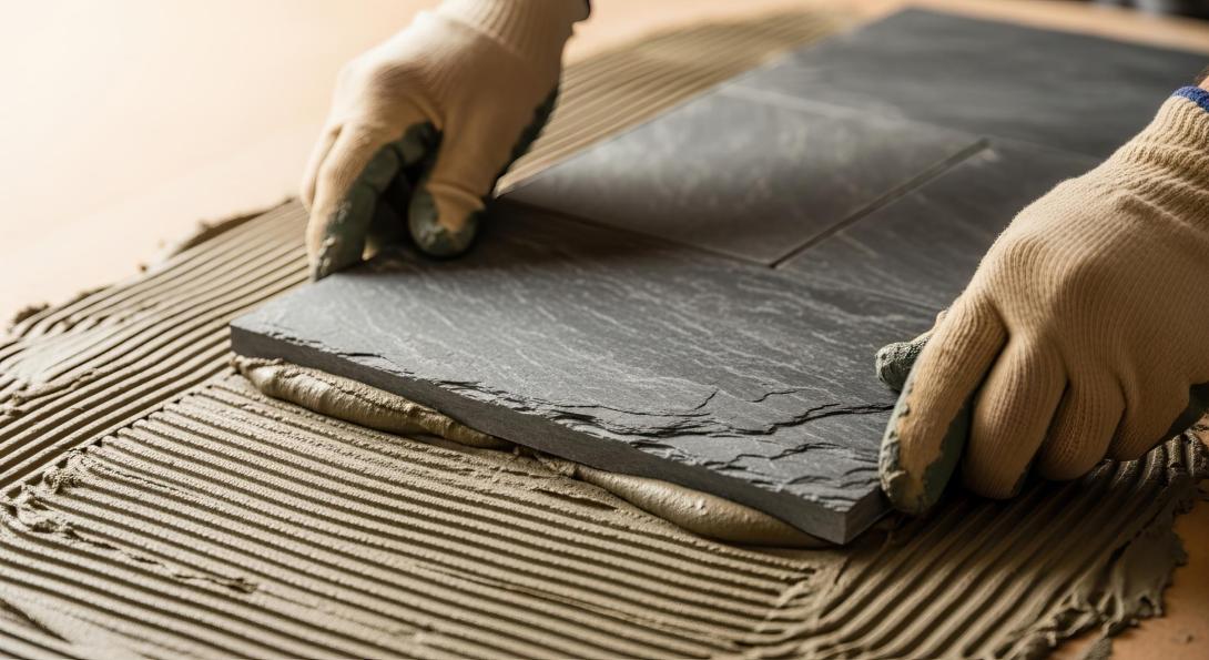 - Dunbedmethode: gebruik cementgebonden, flexibele natuursteenlijm. Breng de lijm kruisgewijs op zowel de ondergrond als de tegel aan (buttering-floating), zodat er volledige hechting wordt gegarandeerd.
